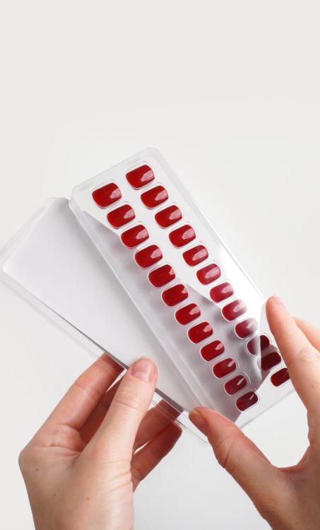 Ouvre l’emballage et sépare délicatement les différentes couches. Retire ensuite le film protecteur transparent des Press Ons en gel souple.