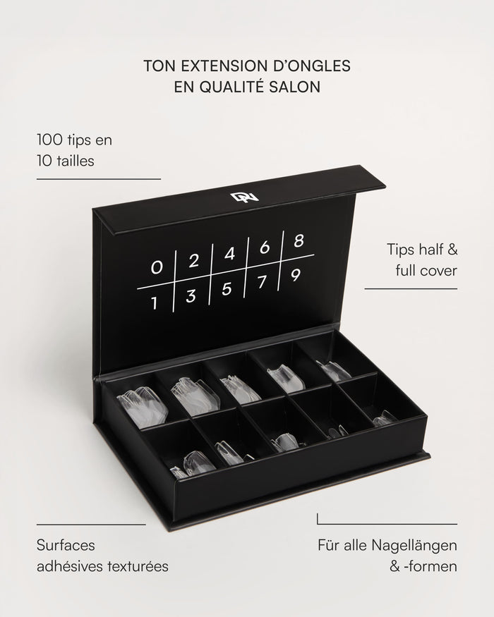Tips flexibles half-cover et full-cover pour l’extension des ongles.