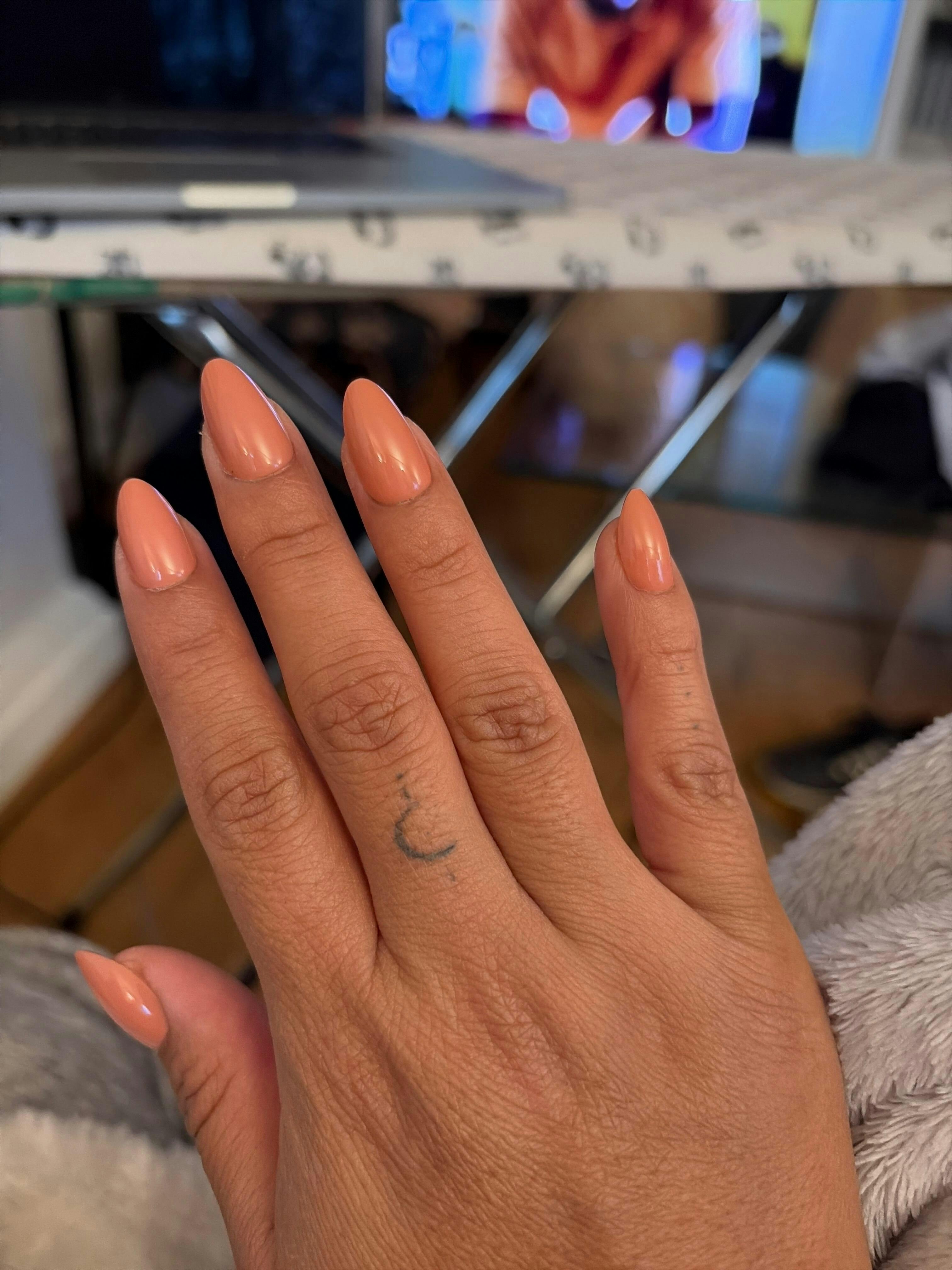 Somehow, I thought the color would be more yellowish, but it's more like Tic-Tac orange. I love it, it gives off fresh vibes and is perfect for summer. The product is acrylic-like, which is why it doesn't need a UV lamp and doesn't damage the nails as much as gel polish.