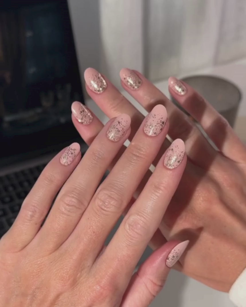 Ce design présente un ombré à paillettes dorées qui fait vraiment ressortir vos ongles ! Si vous adorez les paillettes et le glamour, vous allez définitivement adorer ce look.